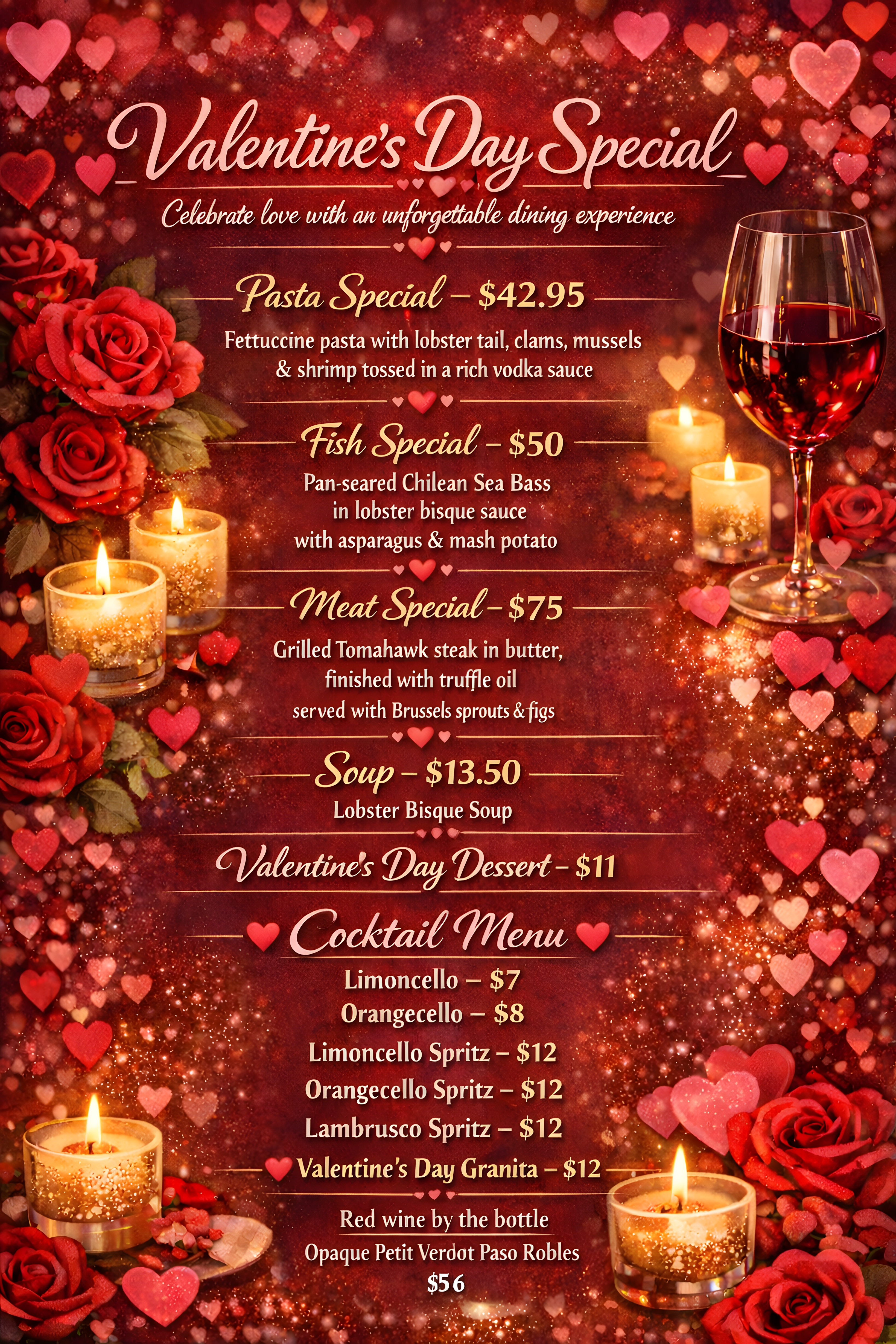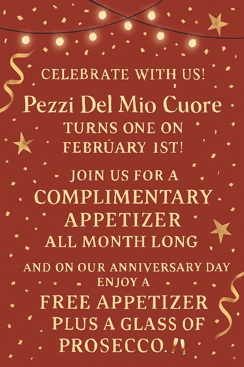At Pezzi Del Mio Cuore, every celebration feels like a family gathering. Whether you're planning a birthday, anniversary, bridal shower, rehearsal dinner, or any special milestone, our restaurant offers the perfect setting to make your event unforgettable. With over 30 years of experience serving San Diego, we know how to create an atmosphere that's both welcoming and memorable.